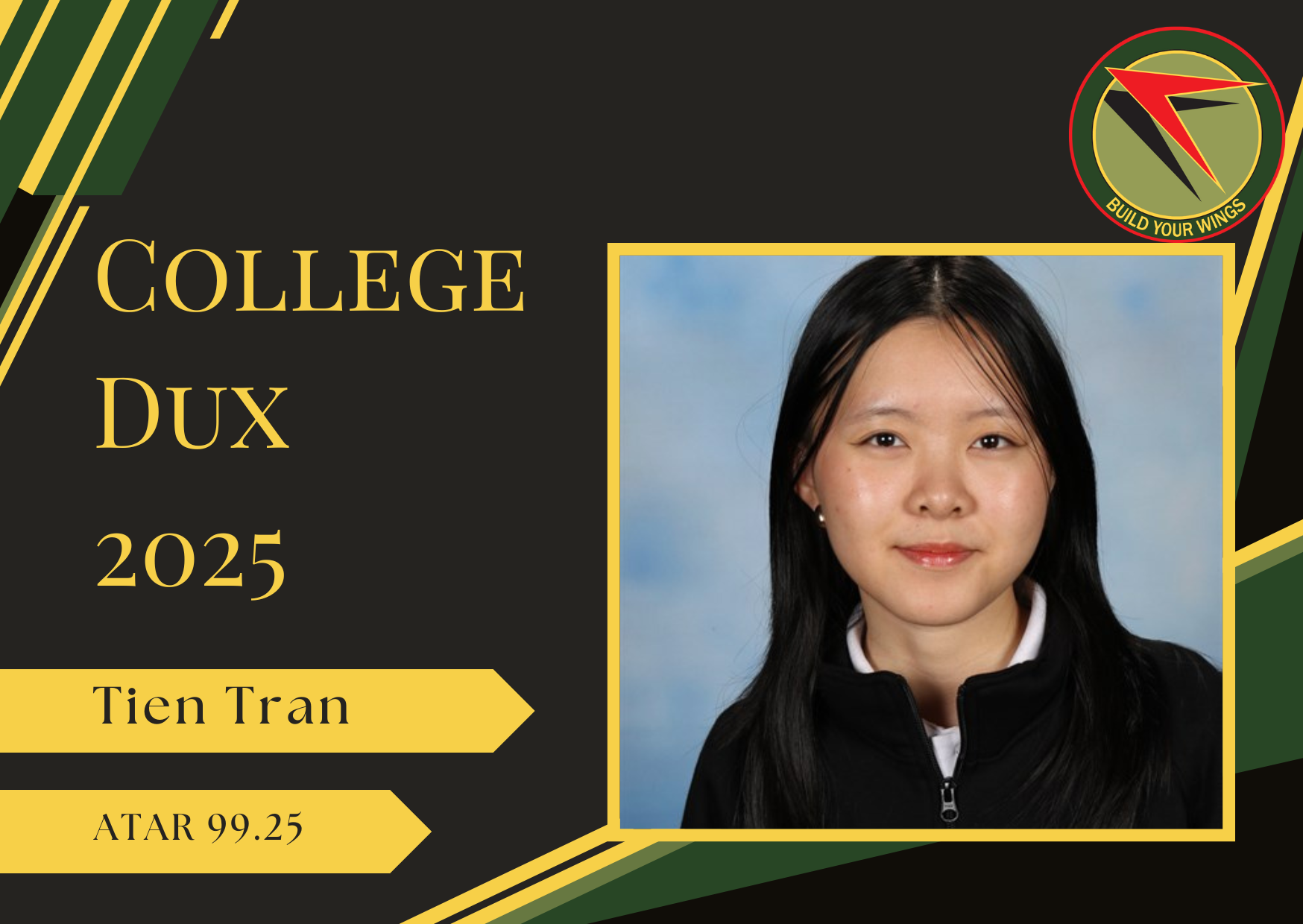On behalf of the college and the Buckley Park College community, we wish to congratulate Tien on achieving the 2025 DUX of Buckley Park College with a score of 99.25 ATAR, which places her in the top 0.75% of Australian results.