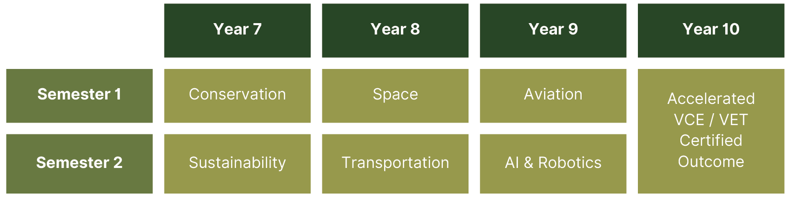 Students will meet the minimum requirements as outlined in the Year 7 - 10 Victorian Curriculum 2.0 achievement standards. Students will be assessed against the standards in: Science, Digital Technology, English, Art, Humanities and Mathematics. Additionally, students will engage in an exclusive STEAM subject: "Future Thinkers", where students will collaborate with each other and industry using the latest technologies to solve real world issues.