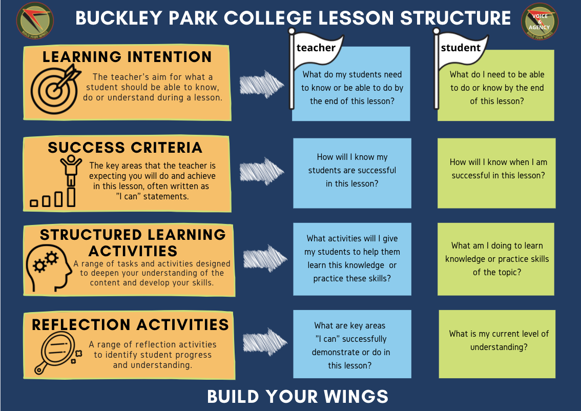 Our agreed Lesson Structure provides the framework for effective Teaching and Learning. It is embedded across our Guaranteed and Viable Curriculum (GVC) and is displayed in every classroom. Our students have come to expect the Lesson Structure and it is the expectation that teachers apply to every class.